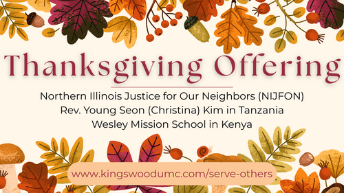 This year’s Thanksgiving Offering will support three meaningful ministries: NIJFON (Northern Illinois Justice For Our Neighbors), which provides free legal services, advocacy, and support for low-income immigrants across Northern Illinois; Rev. Young Seon (Christina) Kim in Tanzania, who trains pastors and lay leaders to connect with young people through youth ministries; and Wesley Mission School in Kenya, which offers quality education to children, helping each student reach their full potential. You can give to this year’s offering using the envelopes in the seats at service or online through the GIVE tab on our website.