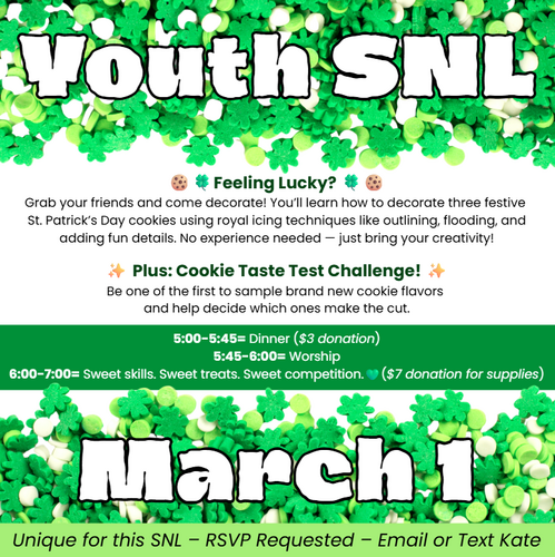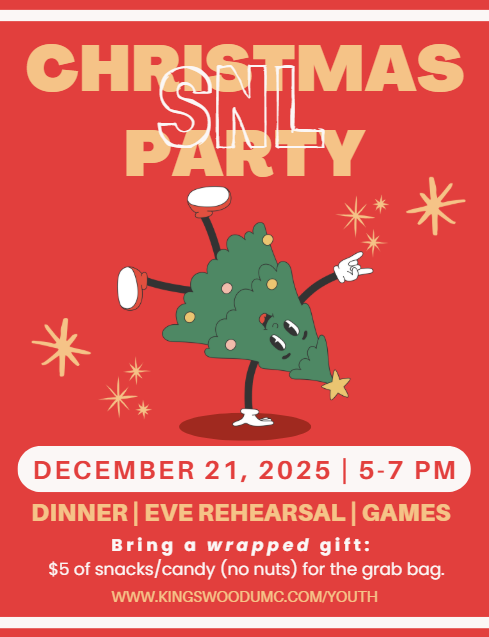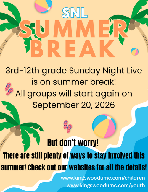 - $3 for dinner (scholarships are always available if needed)—an envelope will be in the Activity Center for cash donations, or you can donate online at our Kingswood Give site and note that it is for SNL.